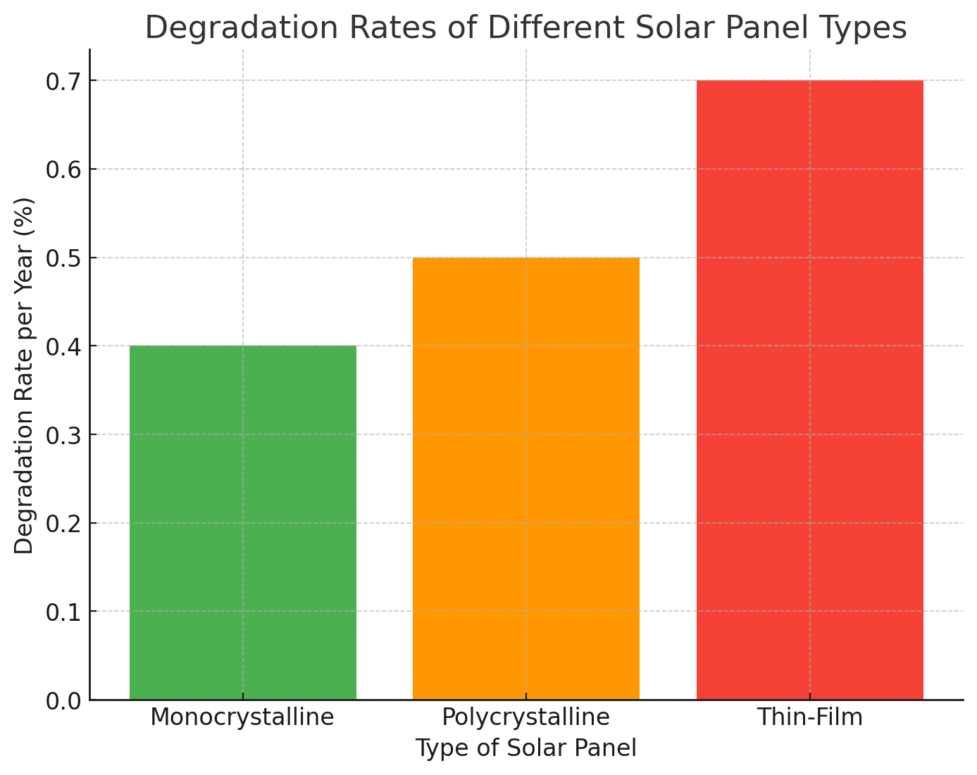 Efficient solar cells significantly impact solar panel life by reducing power loss and slowing down solar panel degradation. Advanced materials like monocrystalline silicon and technologies such as PERC (Passivated Emitter and Rear Cell) enable efficient solar panels to convert more sunlight into electricity, maintaining higher efficiency of solar panels over time. For example, monocrystalline solar panels typically degrade at a rate of about 0.4% per year, while polycrystalline panels degrade at around 0.5% per year. Additionally, bifacial panels, which capture sunlight from both sides, also contribute to extending solar panel life by maximizing energy production. This improved efficiency ensures that solar panels continue to deliver optimal power output throughout their lifespan of 25 to 30 years. The graph below illustrates the relationship between solar panel efficiency and degradation rates over time.